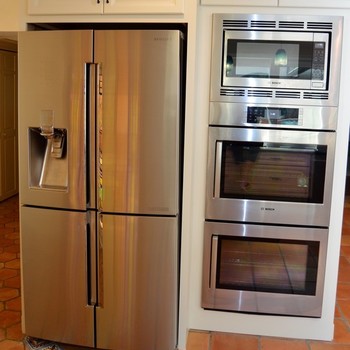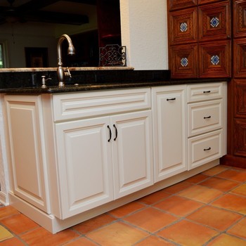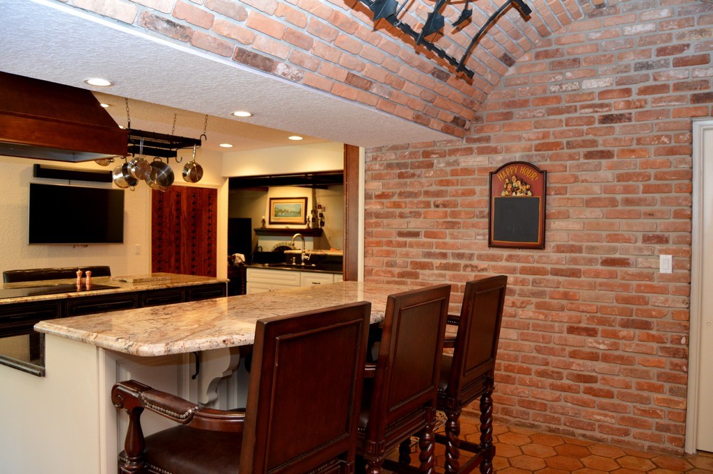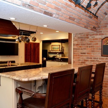 What do you do with a 1960 Spanish river front beachside Villa constructed with old-world materials… carved wood doors and genuine Saltillo flooring and brick walls and wrought iron and stained glass and all the charm you could imagine but NO kitchen?? This home literally has enough entertaining space with the two large family rooms and oversized courtyard and covered dock house to bring in over 100 people at a time… but the kitchen was a mere SPOT on the floor with passageways like tiny corridors where no one was meant to pass. Without adding a single square foot to the layout, we “knock out” a wall or two; restructured the bearing points; removed the dark and gloomy components; and rebuilt the space into one of our largest kitchens ever! Browse these pictures to see how we designed this existing space to encompass all the style of the surrounding home and yet offered these homeowners a brand new space to entertain in! We reused the original carved inlaid cabinet doors and combined them for a wall of storage and coffee center. The carved closet doors were refashioned into a pantry. The new space includes the incorporation of a brick barrel ceiling bar area, genuine copper sinks, double dishwashers, a triple oven, an induction cooktop, double pot racks, benches and stools and three separate counter bars plus a dinette table give way to more than 15 seats in the one conjoined area! With nearly 60 linear feet of countertop space, this kitchen will serve well all that come to pass!